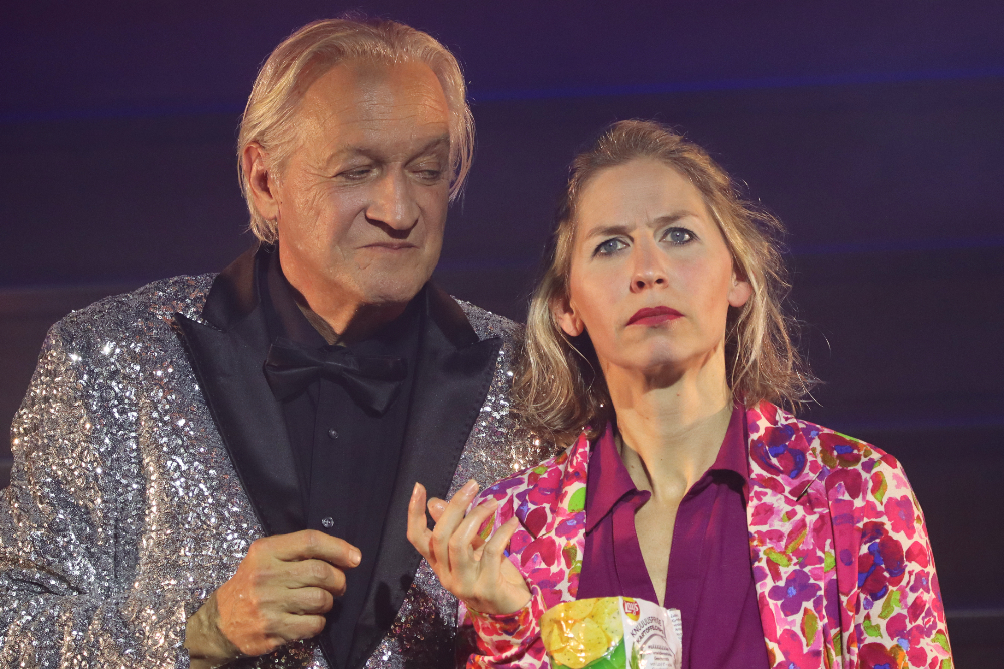 Meinhard Zanger inszeniert das Stück mit offensichtlich diabolischer Freude, rasantem Tempo und satter Bühnenwirkung, Knalleffekte und Pulverdampf inklusive. Im Zentrum steht eine grell ausgeleuchtete Showbühne, wie man sie aus klassischen Fernsehsendungen kennt. Hier marschieren sie der Reihe nach auf: Moderator und Conférencier im Glitzeranzug (